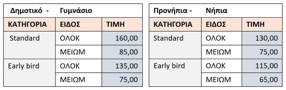 Ισχύουν ειδικές μειωμένες τιμές (early bird) για κρατήσεις μέχρι και τις 15/5 και μειωμένες τιμές για αδερφάκια και πολύτεκνες οικογένειες.