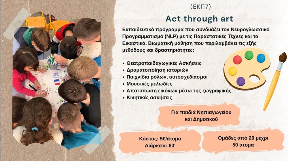 Τα παιδιά, περισσότερο από ποτέ, χρειάζονται ευκαιρίες για δημιουργία, εκτόνωση, χαλάρωση και χαρά. Στις ομάδες αυτές δημιουργούμε έναν χώρο φαντασίας, εκτόνωσης και δημιουργικότητας, όπου τα παιδιά καλούνται να εξερευνήσουν τον κόσμο της τέχνης, της επικοινωνίας και της έκφρασης μέσω του φυσικού πηλού, των χρωμάτων και της Process Art (δηλαδή της Τέχνης της Διαδικασίας, όπου η διαδικασία δημιουργίας ενός έργου είναι το πιο σημαντικό στοιχείο και όχι αναγκαστικά κάποιο τελικό αντικείμενο).
