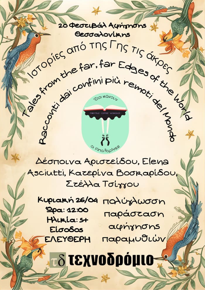 Την Κυριακή 26 Απριλίου το βιβλιοπωλείο-καφέ “Έτσι κάνουν οι Μπαλαρίνες” σας προσκαλεί παιδιά 5 ετών και άνω σε μια πολύγλωσση παράσταση αφήγησης παραμυθιών με τον τίτλο: “Ιστορίες από της Γης τις άκρες | Tales from the far, far edges of the World | Racconti dai confini più remoti del Mondo”