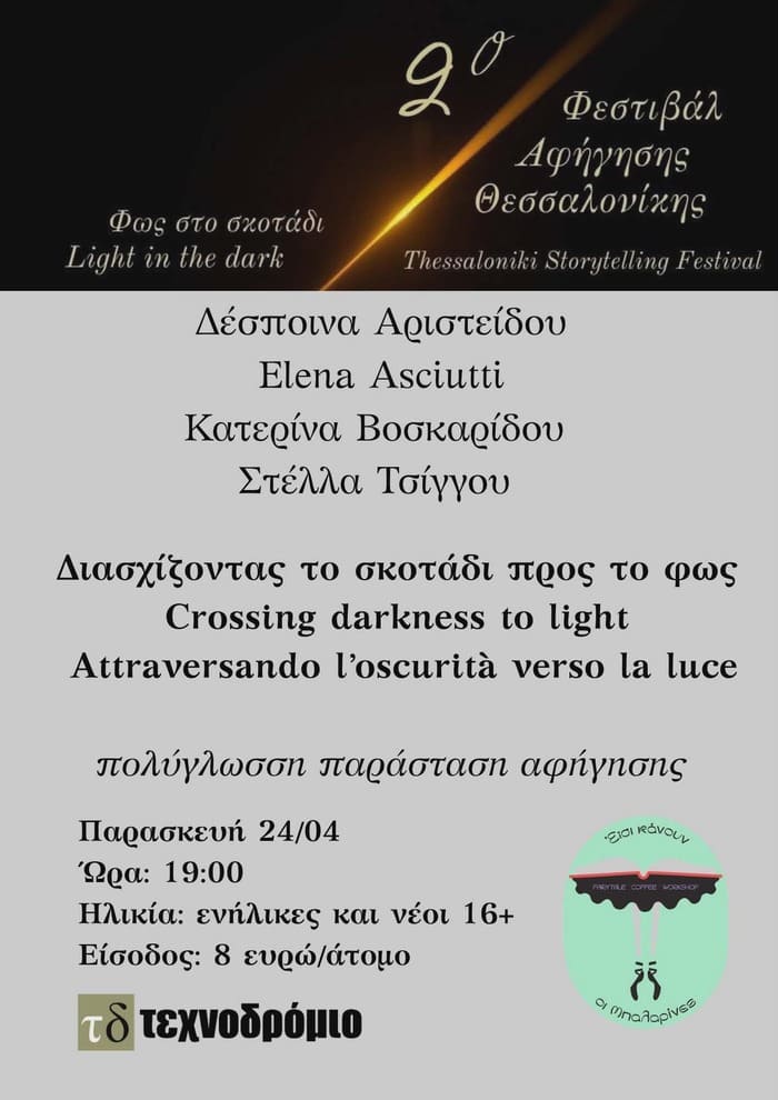 Στα πλαίσια του 2ου Φεστιβάλ Αφήγησης Θεσσαλονίκης η Δέσποινα Αριστείδου, η Elena Asciutti, η Κατερίνα Βοσκαρίδου και η Στέλλα Τσίγγου μοιράζονται ιστορίες σε μια πολύγλωσση παράσταση αφήγησης (ελληνικά, αγγλικά, ιταλικά), όπου οι λέξεις, οι φωνές, οι ανάσες, σμίγουν για να φωτίσουν το σκοτάδι.