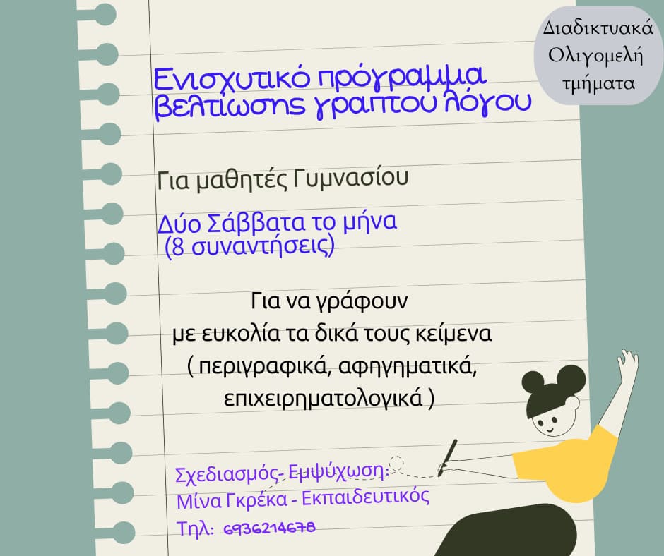 Το ενισχυτικό πρόγραμμα βελτίωσης γραπτού λόγου για μαθητές Γυμνασίου ξεκινάει το Σάββατο 8/11 στις 16:00 -17:30 και θα διεξάγεται διαδικτυακά.