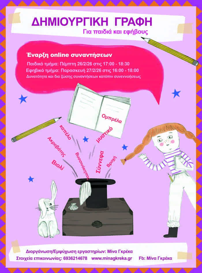 Η γραφή γίνεται ένα εργαλείο έκφρασης και επικοινωνίας, στο εργαστήρι δημιουργικής γραφής που έρχεται την Πέμπτη 26 Φεβρουαρίου 2026, στις 17:00. Ένας τρόπος να παίξουν τα παιδιά με τις λέξεις και να δημιουργήσουν τις δικές τους μοναδικές ιστορίες.
