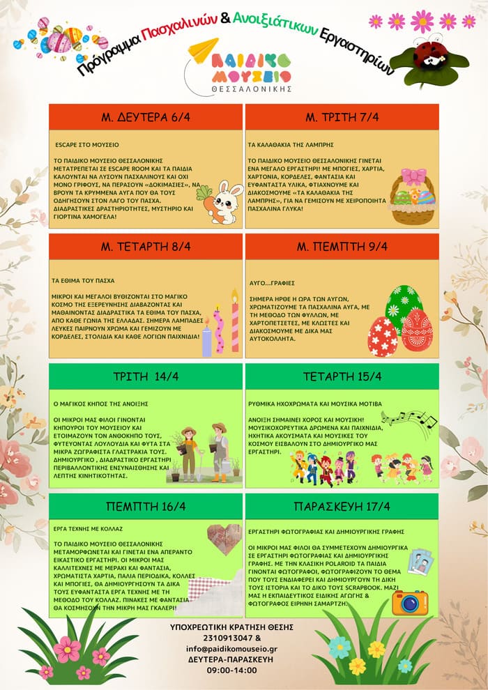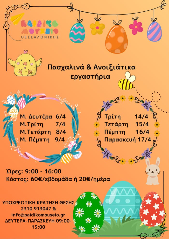 Πασχαλινά και ανοιξιάτικα δημιουργικά εργαστήρια για παιδιά 4 – 12 ετών στο Παιδικό Μουσείο Θεσσαλονίκης.