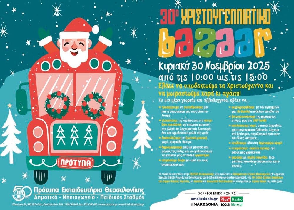 Το Σχολείο για 30η συνεχόμενη χρονιά προσκαλεί τις οικογένειες της πόλης στη Χριστουγεννιάτικη Φιλανθρωπική Εορταγορά, την Κυριακή 30 Νοεμβρίου 2025, από τις 10:00 έως τις 15:00, στις εγκαταστάσεις του στους Ελαιώνες Πυλαίας.