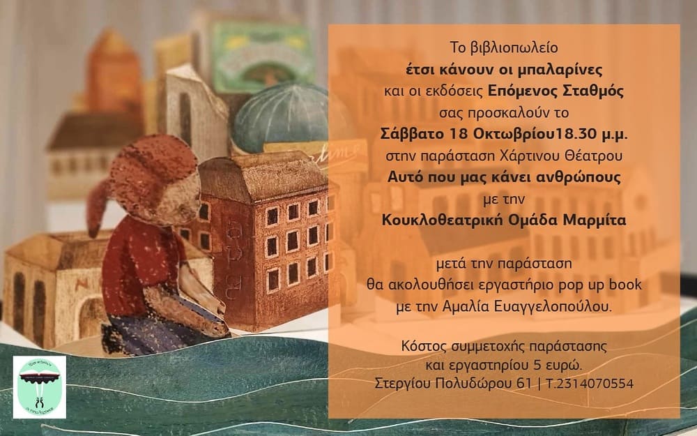 Το Σάββατο 18 Οκτωβρίου το βιβλιοπωλείο «Έτσι κάνουν οι μπαλαρίνες» και οι εκδόσεις Επόμενος Σταθμός σε συνεργασία με την ομάδα κουκλοθέατρου Μαρμίτα προτείνουν μια ξεχωριστή pop up θεατρική παρουσίαση του βιβλίου «Αυτό που μας κάνει ανθρώπους».