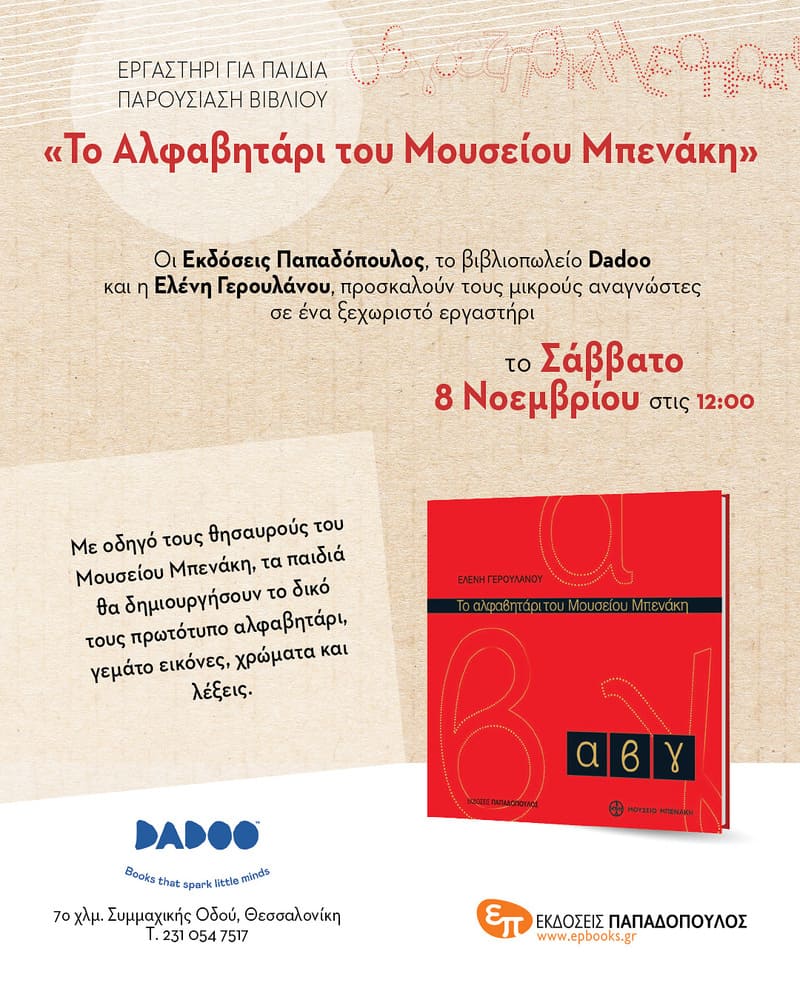 Το Σάββατο 8 Νοεμβρίου, στις 12.00, τη σκυτάλη παίρνουν τα παιδιά συμμετέχοντας σε ένα μοναδικό εργαστήρι με αφορμή το βιβλίο «Το αλφαβητάρι του Μουσείου Μπενάκη».