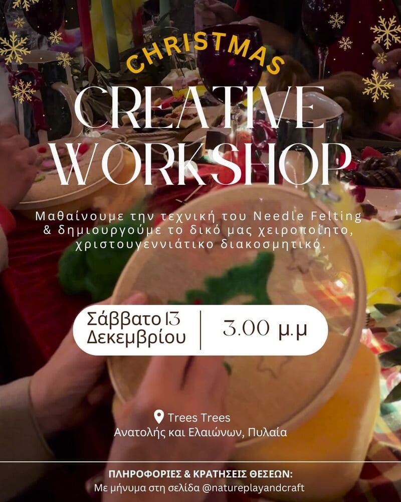 Ένα ιδιαίτερο χριστουγεννιάτικο εργαστήρι needle felting από τη nature play and craft φιλοξενείται το Σάββατο 13 Δεκεμβρίου στην αυλή του treestrees, προσκαλώντας μικρούς και μεγάλους, σε μια απογευματινή εμπειρία χαλάρωσης και δημιουργίας.