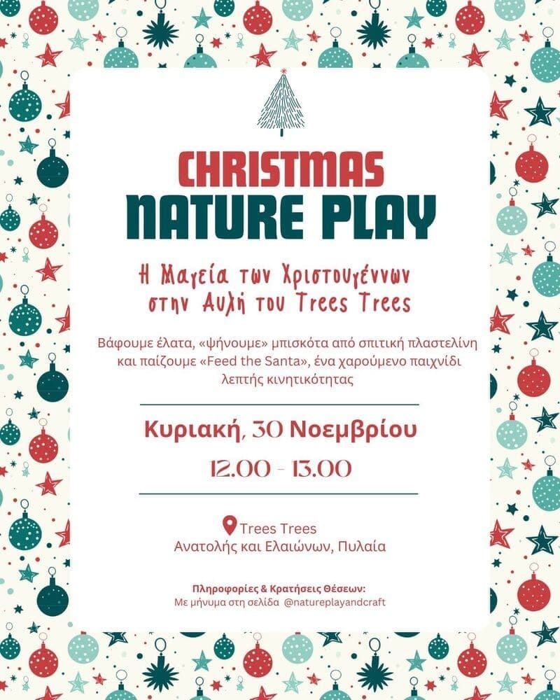 Την Κυριακή 30 Νοεμβρίου το Nature Play & Craft πραγματοποιεί το «Xmas Nature Play», ένα χριστουγεννιάτικο εργαστήρι για γονείς και παιδιά, που υπόσχεται μια ώρα γεμάτη δημιουργία, φυσικά υλικά και γιορτινή διάθεση.