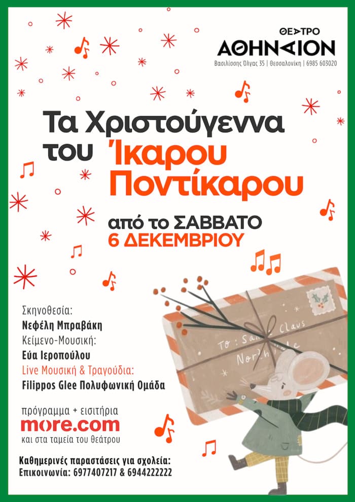 Ο αγαπημένος Ίκαρος Ποντίκαρος επιστρέφει με μια εντελώς νέα ιστορία, καινούρια τραγούδια και πολλή χριστουγεννιάτικη μαγεία! Η ολοκαίνουργια παιδική μουσικοθεατρική παράσταση, κατάλληλη για παιδιά από 4 ετών, παρουσιάζεται από 6 Δεκεμβρίου 2025 έως 6 Ιανουαρίου 2026, στο ανανεωμένο Θέατρο Αθήναιον. Η Εύα Ιεροπούλου, δημιουργός των τραγουδιών και των κειμένων, υπογράφει μια φρέσκια, συγκινητική και χιουμοριστική μουσικοθεατρική περιπέτεια για μικρούς και μεγάλους.
