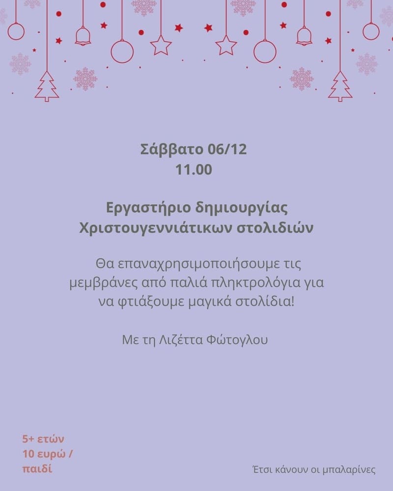 Προσκαλεί τους μικρούς του φίλους το Σάββατο 6 Δεκεμβρίου, σε ένα ξεχωριστό εργαστήριο δημιουργίας χριστουγεννιάτικων στολιδιών, όπου θα επαναχρησιμοποιήσουν τις μεμβράνες από παλιά πληκτρολόγια για να φτιάξουν μαγικά στολίδια!