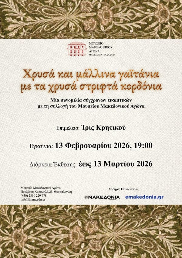 Το Ίδρυμα Μουσείου Μακεδονικού Αγώνα και της Νεότερης Ιστορίας της Μακεδονίας (ΙΜΜΑ) προσκαλεί το κοινό στην ομαδική εικαστική έκθεση με τίτλο «Χρυσά και μάλλινα γαϊτάνια με τα χρυσά στριφτά κορδόνια» σε επιμέλεια της Αρχαιολόγου-Ιστορικού Τέχνης, Ίριδας Κρητικού, που θα πραγματοποιηθούν την Παρασκευή 13 Φεβρουαρίου 2026 στις 19:00, στους μόνιμους εκθεσιακούς χώρους του Μουσείου Μακεδονικού Αγώνα.