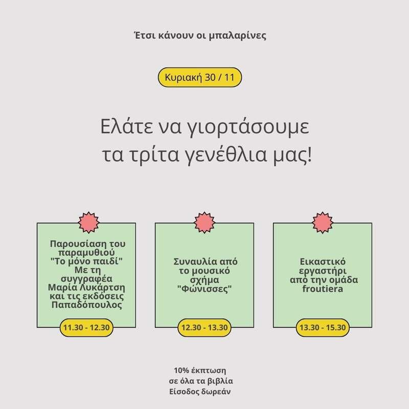 Την Κυριακή 30 Νοεμβρίου το βιβλιοπωλείο-καφέ “Έτσι κάνουν οι μπαλαρίνες” κλείνει τρία χρόνια λειτουργίας και περιμένει μικρούς και μεγάλους να γιορτάσουν μαζί του.