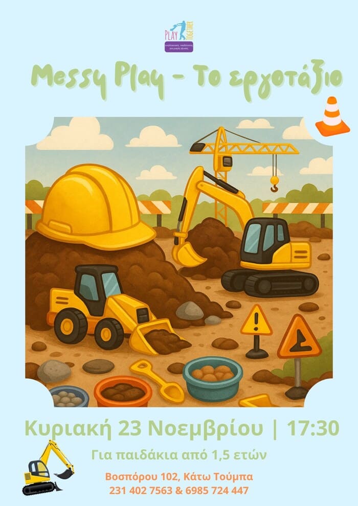 Το PlayTogether παρουσιάζει μια μοναδική δράση για παιδιά από 1,5 ετών και άνω, που λατρεύουν το χώμα, τις μπουλντόζες και το δημιουργικό παιχνίδι. Την Κυριακή 23 Νοεμβρίου, οι συμμετέχοντες θα βουτήξουν σε ένα ολοκληρωμένο θεματικό εργαστήρι γεμάτο αισθητηριακή εξερεύνηση, κατασκευές και… πολλή λάσπη!