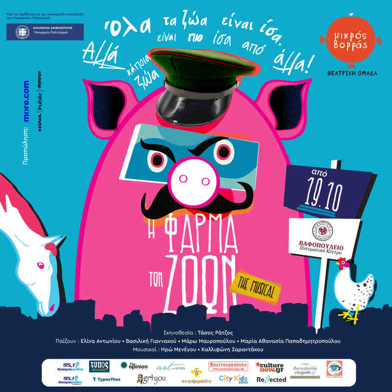 Η θεατρική ομάδα Μικρός Βορράς, με 14 χρόνια δημιουργίας στο θέατρο για παιδιά και νέους, παρουσιάζει τη νέα της παραγωγή: «Η Φάρμα των Ζώων – The Musical», βασισμένη στο παγκόσμιας φήμης έργο του Τζορτζ Όργουελ, ειδικά προσαρμοσμένη για παιδιά.