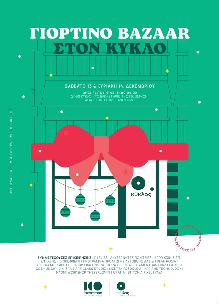 Ο Κύκλος – το εργαστήριο της incommon φοράει τα ‘’καλά’’ του και φιλοξενεί για άλλη μια χρονιά το ξεχωριστό του γιορτινό bazaar βιωσιμότητας το Σάββατο 13 & την Κυριακή 14 Δεκεμβρίου, από τις 11.00 μέχρι τις 20.00 (Αγίας Σοφίας 105, Άνω Πόλη Θεσσαλονίκης). Με κεντρικό μήνυμα “Ας χαρίσουμε φέτος δώρα γεμάτα νόημα” ο Κύκλος προσκαλεί το κοινό για πέμπτη συνεχή χρονιά στον ζεστό του χώρο, για να περάσει όμορφα και γιορτινά αγοράζοντας με περιβαλλοντική φροντίδα!