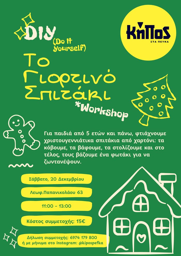 Το Σάββατο 20 Δεκεμβρίου, ο Κήπος στα Πεύκα προσκαλεί τα παιδιά σε ένα ξεχωριστό δημιουργικό εργαστήρι με τίτλο «Το Γιορτινό Σπιτάκι», μια βιωματική εμπειρία γεμάτη φαντασία και δημιουργικότητα.
