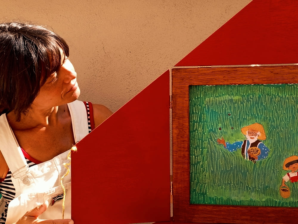 Το Kamishibai (Kami = χαρτί, shibai = θέατρο) είναι μια χαρακτηριστική μορφή αφήγησης με εικόνες που γεννήθηκε στην Ιαπωνία. Το Kamishibai ανήκει σε μια μακρά παράδοση αφήγησης παραμυθιών στο δρόμο, στην οποία ο λόγος και οι εικόνες συνδυάζονται με μια άμεση συνάντηση με το κοινό.