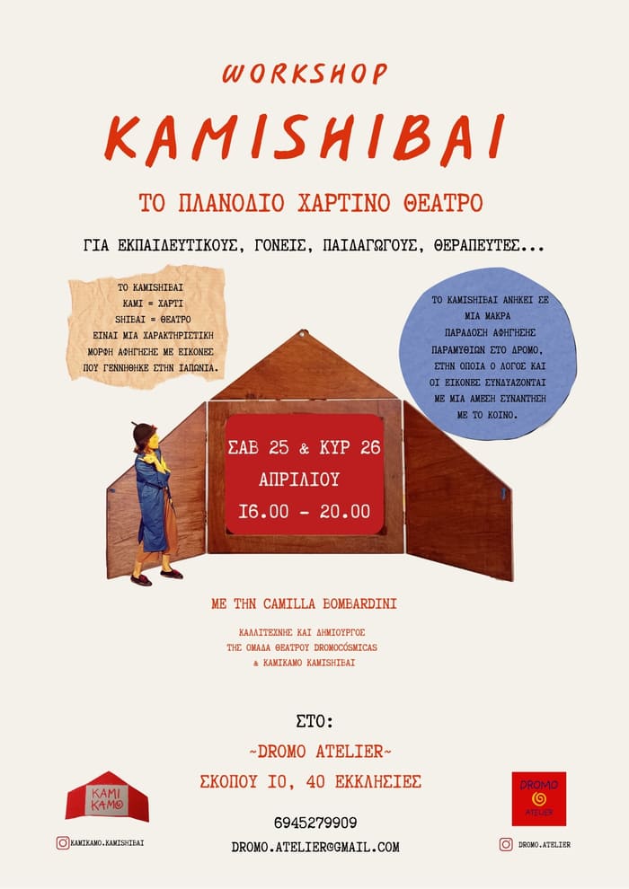 • Πώς λειτουργεί το Kamishibai και πώς δημιουργείται μια μικρή ιστορία (γράφοντας, σχεδιάζοντας και φτιάχνοντας τους πίνακες, εξερευνώντας τεχνικές σχεδίασης, κολάζ…)