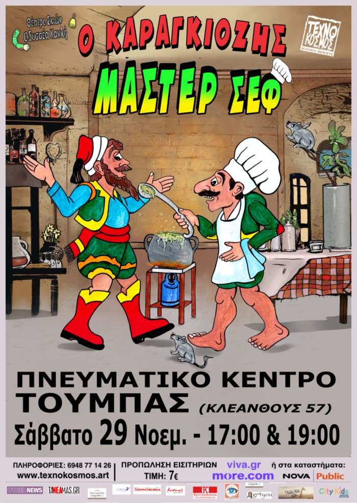 Ο Τεχνόσκοσμος, σε συνεργασία με το Θέατρο Σκιών Οδυσσέα Κανλή, παρουσιάζει μια ολοκαίνουργια περιπέτεια θεάτρου σκιών γεμάτη γέλιο, ζωντάνια και την ανεπανάληπτη μαγεία του Καραγκιόζη. Με σεβασμό στην παράδοση και τη γνώριμη τεχνική του Οδυσσέα Κανλή, ο αγαπημένος λαϊκός ήρωας επιστρέφει στη σκηνή του Πνευματικού Κέντρου Τούμπας, Κλεάνθους 57, το Σάββατο 29 Νοεμβρίου με την παράσταση «Ο Καραγκιόζης Μάστερ Σεφ».