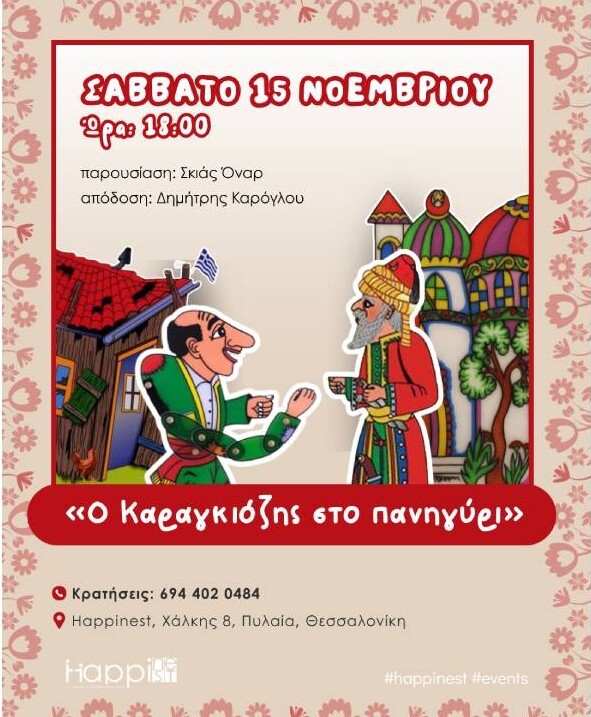 Το Σάββατο 15 Νοεμβρίου 2025, το Happinest προσκαλεί τα παιδιά με τις οικογένειές τους σε μια παραδοσιακή παράσταση θεάτρου σκιών, με πρωταγωνιστή φυσικά τον αγαπημένο Καραγκιόζη.