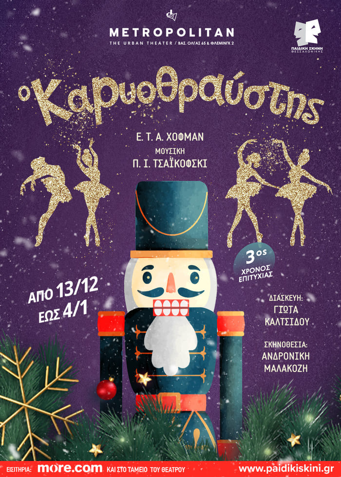 Για τρίτη συνεχόμενη χρονιά, η Παιδική Σκηνή Θεσσαλονίκης παρουσιάζει την κλασική χριστουγεννιάτικη ιστορία του Γερμανού Έρνεστ Τέοντορ Αμαντέους Χόφμαν, «Ο Καρυοθραύστης»! Από τις 13 Δεκεμβρίου έως τις 4 Ιανουαρίου, ο αγαπημένος ήρωας μικρών και μεγάλων επιστρέφει στο θέατρο Metropolitan, για να μας μιλήσει για το μεγαλείο της αγάπης, μέσα από μια παράσταση γεμάτη από τις μελωδίες του Τσαϊκόφσκι, που θα ζεστάνει τις καρδιές μας και θα γίνει μια μεγάλη αγκαλιά για να χωρέσουν όλοι, όπως ακριβώς είναι.
