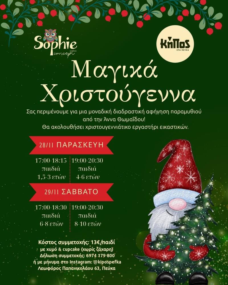 Σε συνεργασία με τη Sophie Concept, ο Κήπος στα Πεύκα, θα υποδεχθεί τους επισκέπτες με αφήγηση παραμυθιών από την Άννα Θωμαΐδου, με εργαστήρια εικαστικών, παιχνίδι και χριστουγεννιάτικες εκπλήξεις, με σκοπό να μπουν όλοι στο κλίμα των γιορτών.