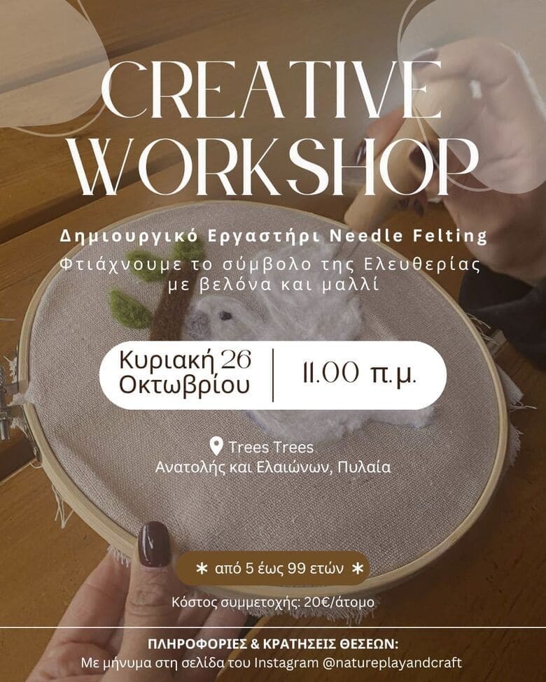 Την Κυριακή 26 Οκτωβρίου, πραγματοποιείται στην αυλή του Trees trees ένα ξεχωριστό εργαστήριο Needle Felting, στο οποίο οι συμμετέχοντες θα έχουν την ευκαιρία να δημιουργήσουν με μαλλί και βελόνα το σύμβολο της Ελευθερίας.