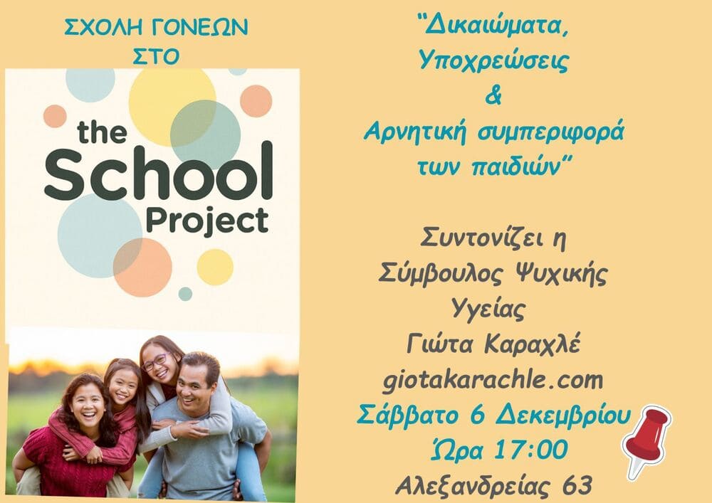 Το The School Project διοργανώνει μία θεματική συνάντηση αφιερωμένη στα δικαιώματα, τις υποχρεώσεις και τη διαχείριση της αρνητικής συμπεριφοράς των παιδιών, το Σάββατο 6 Δεκεμβρίου στις 17:00, στον χώρο του, στην Αλεξανδρείας 63.