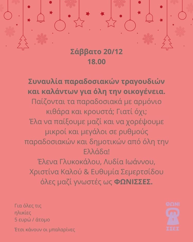 Συναυλία παραδοσιακών τραγουδιών και καλάντων για όλη την οικογένεια θα πραγματοποιηθεί το Σάββατο 20 Δεκεμβρίου στο βιβλιοπωλείο-καφέ «Έτσι κάνουν οι μπαλαρίνες».