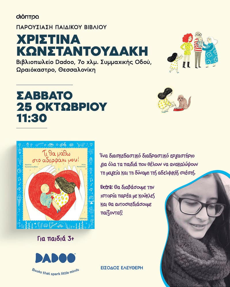 Το Σάββατο 25 Οκτωβρίου στις 11.30 το DADOO σε συνεργασία με τις εκδόσεις Διόπτρα φιλοξενούν με μεγάλη χαρά τη συγγραφέα Χριστίνα Κωνσταντουδάκη και την παρουσίαση του βιβλίου της με τίτλο «Τι θα μάθω στο αδερφάκι μου».