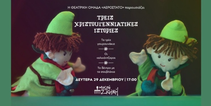 Η θεατρική ομάδα «Αερόστατο» παρουσιάζει τη Δευτέρα 29 Δεκεμβρίου 2025, στη Μικρή Σκηνή, μια ξεχωριστή θεατρική πρόταση για παιδιά, αποτελούμενη από τρία απολαυστικά έργα, γεμάτα γέλιο, τραγούδι και φαντασία.