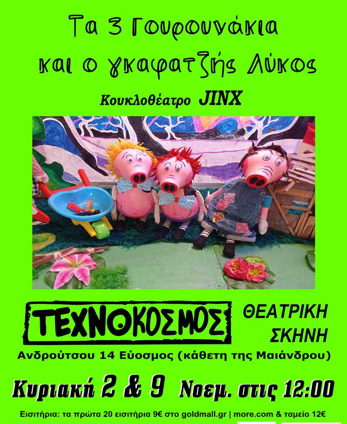Η Θεατρική Σκηνή Τεχνόκοσμος υποδέχεται την ομάδα κουκλοθέατρου JINX με την ξεκαρδιστική παράσταση «Τα Τρία Γουρουνάκια και ο Γκαφατζής Λύκος», την Κυριακή 2 και 9 Νοεμβρίου, στις 12:00 το μεσημέρι.