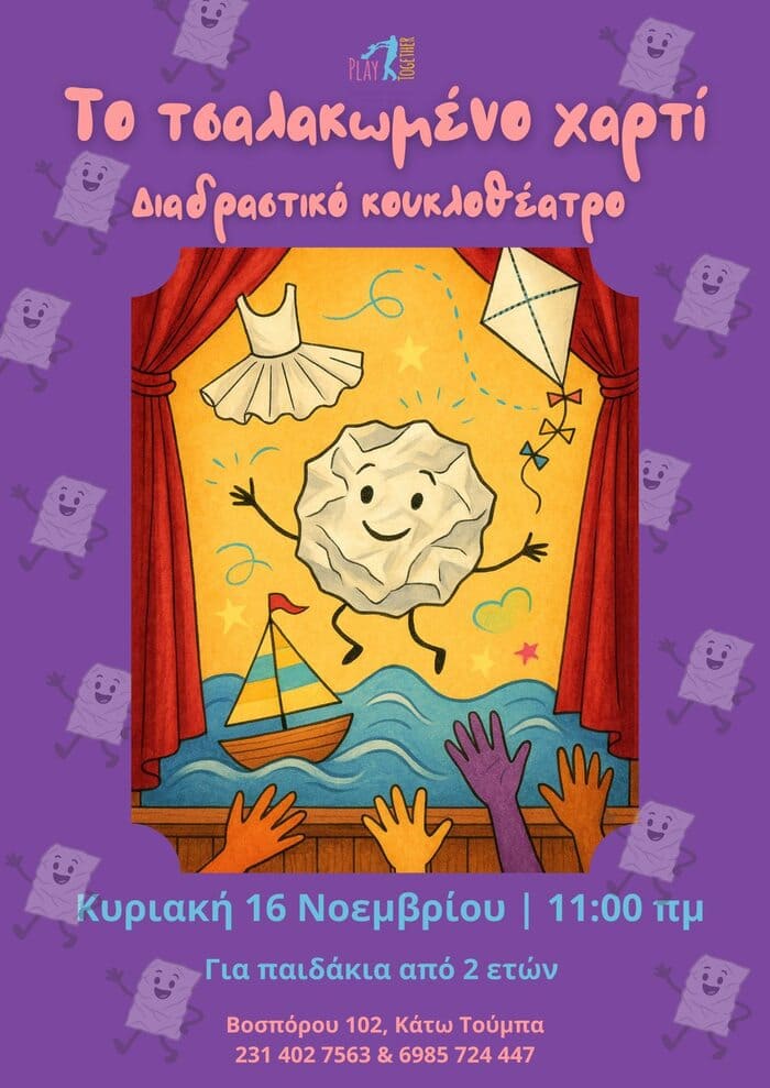 Το Playtogether προσκαλεί τα παιδιά την Κυριακή 16 Νοεμβρίου σε ένα πρωτότυπο διαδραστικό κουκλοθέατρο γεμάτο μουσική, κίνηση και… χάρτινες ανατροπές!
