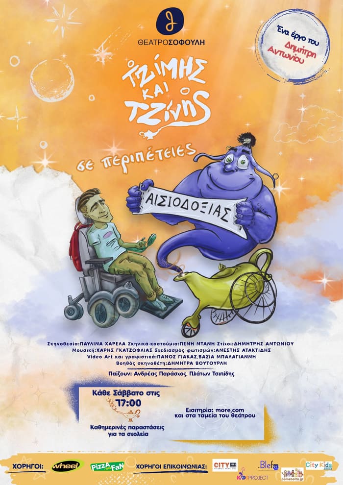 Το Θέατρο Σοφούλη για τη θεατρική σεζόν 2025-2026 παρουσιάζει την παράσταση “Ο Τζίμης και ο Τζίνης, σε περιπέτειες αισιοδοξίας” βασισμένη στο ομώνυμο μυθιστόρημα του Δημήτρη Αντωνίου και σκηνοθεσία Παυλίνας Χαρέλα.