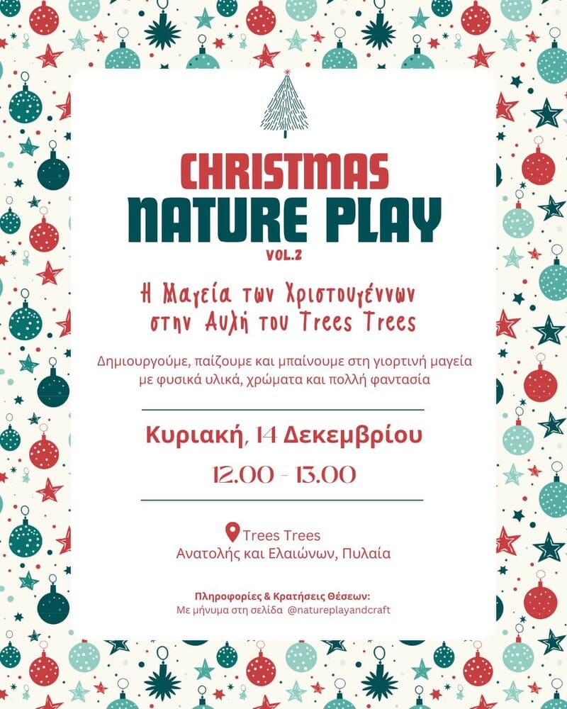 Την Κυριακή 14 Δεκεμβρίου το Nature Play & Craft πραγματοποιεί πάλι το «Xmas Nature Play», ένα χριστουγεννιάτικο εργαστήρι για γονείς και παιδιά, που υπόσχεται μια ώρα γεμάτη παιχνίδι, χρώμα και ακόμη περισσότερη γιορτινή διάθεση.